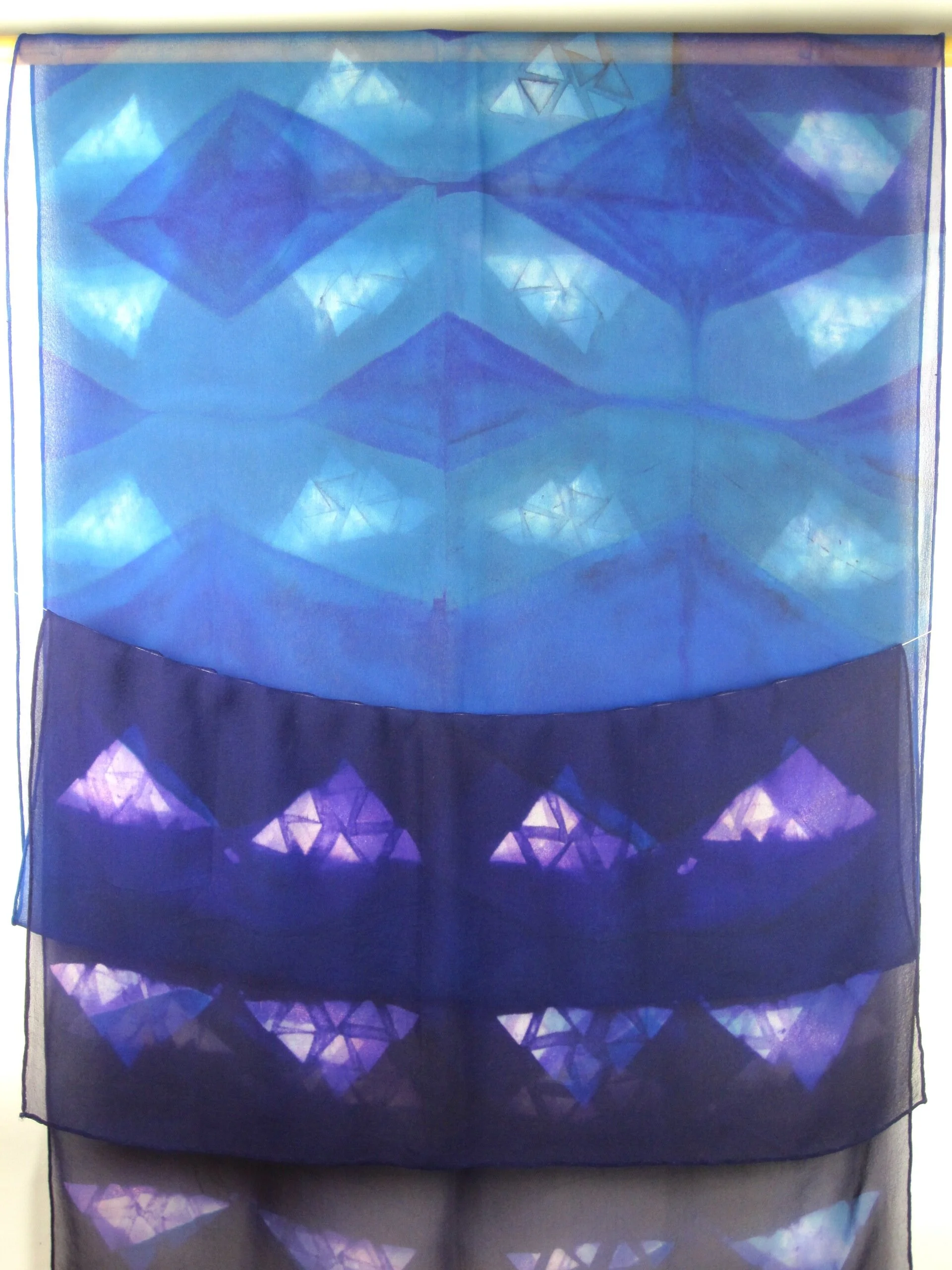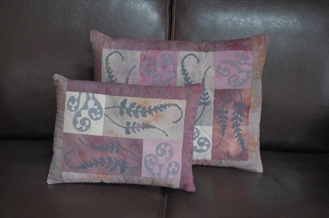 Marion handcrafts quilts, throws, wall hangings and table runners using a variety of different fabrics including cotton batiks, silk, velvet, metallics, and her own hand dyed cottons. Some pieces are hand stamped with block print images for a layered effect. All designs are variations of traditional patterns as a well as her own originals.